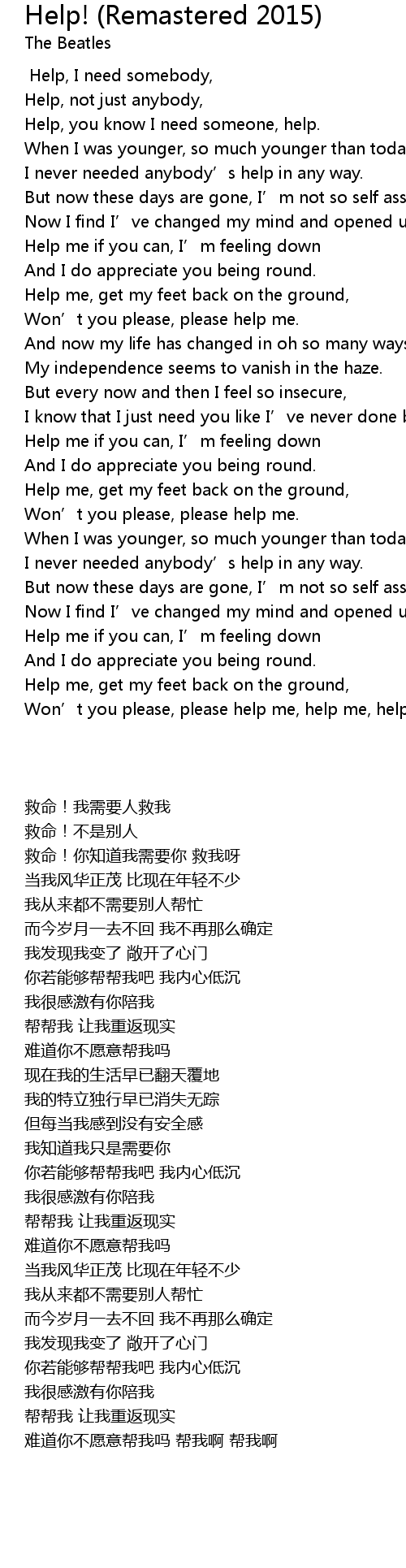 | [01:51.53] | Help me if you can, I’m feeling down |