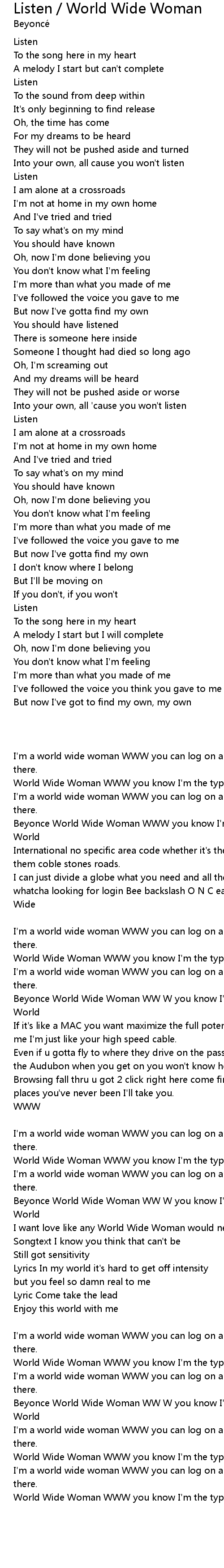 | Beyonce World Wide Woman WWW you know I'm the type of girl. | |