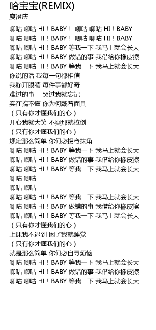 | [00:53.420] | 唧咕 唧咕 HI!BABY 等我一下 我马上就会长大 |
