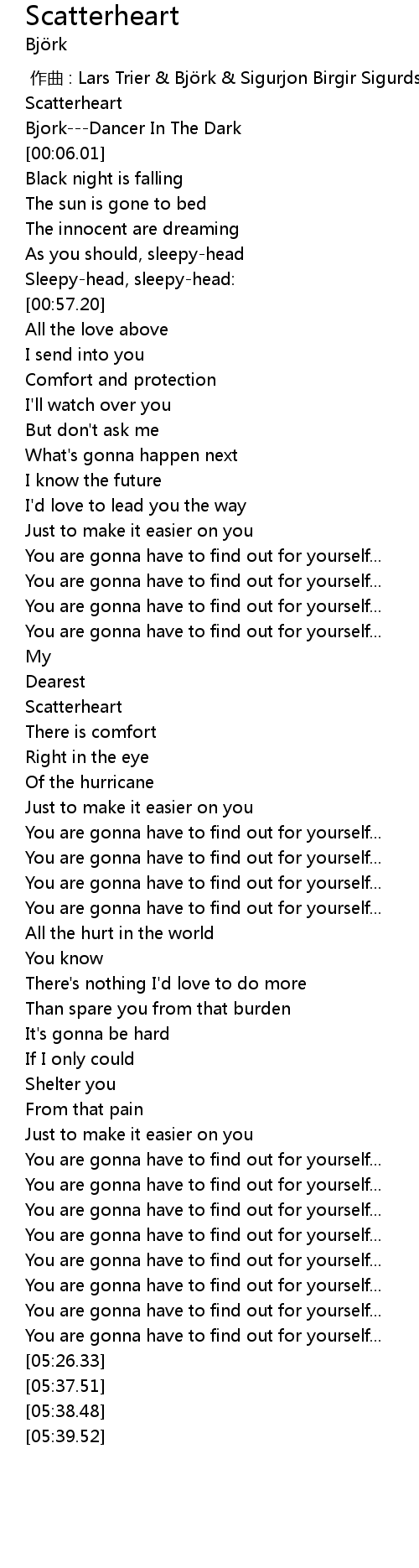 | [00:00.00] | 作曲 : Lars Trier & Björk & Sigurjon Birgir Sigurdsson |