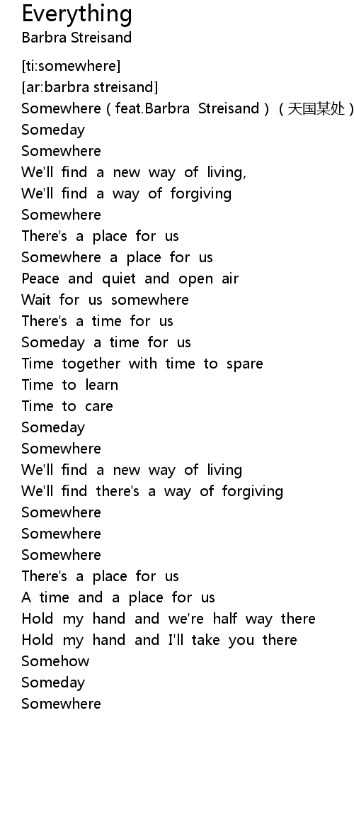 | [00:06.20] | Somewhere feat. Barbra Streisand tiān guó mǒu chù |