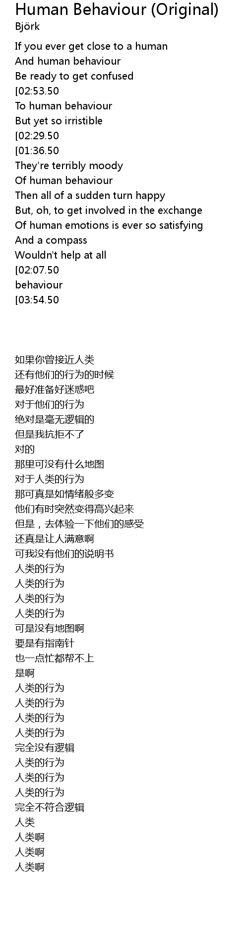 [02:03.50][02:07.50][02:12.50][02:16.50][02:38.50][02:42.50][02:47.50][02:51.50][02:56.50][03:00.50][03:04.50] Human behaviour