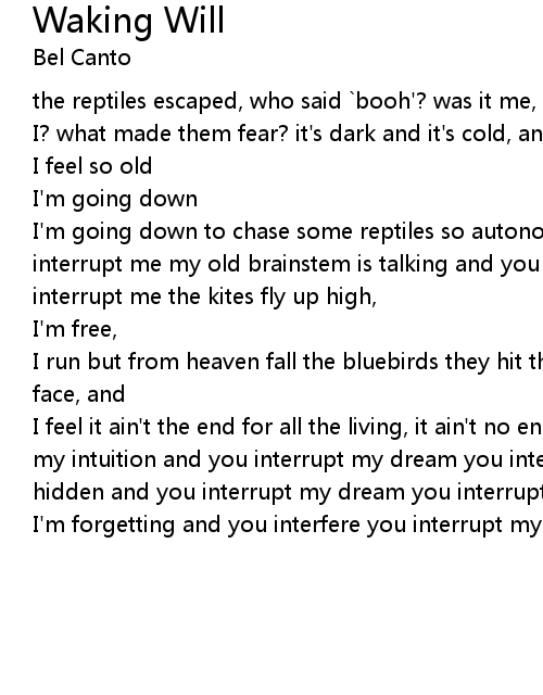 I'm going down to chase some reptiles so autonomic and you interupt my dream you interrupt me my old brainstem is talking and you interrupt my dream you interrupt me the kites fly up high, |