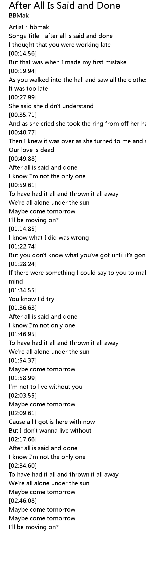 | [00:42.08] | Then I knew it was over as she turned to me and said |