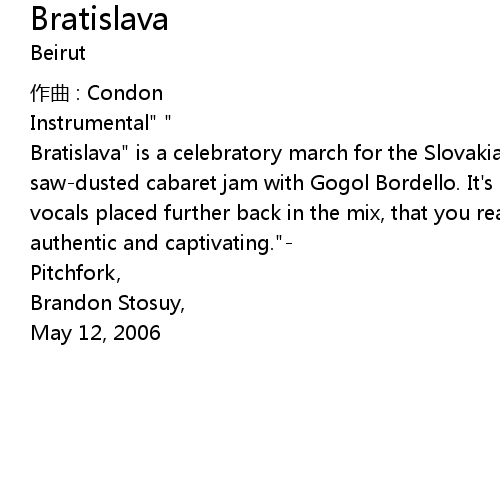 | Bratislava" is a celebratory march for the Slovakian capital a sweaty, sawdusted cabaret jam with Gogol Bordello. It' s at moments like these, his vocals placed further back in the mix, that you realize the kid sounds truly authentic and captivating." | |