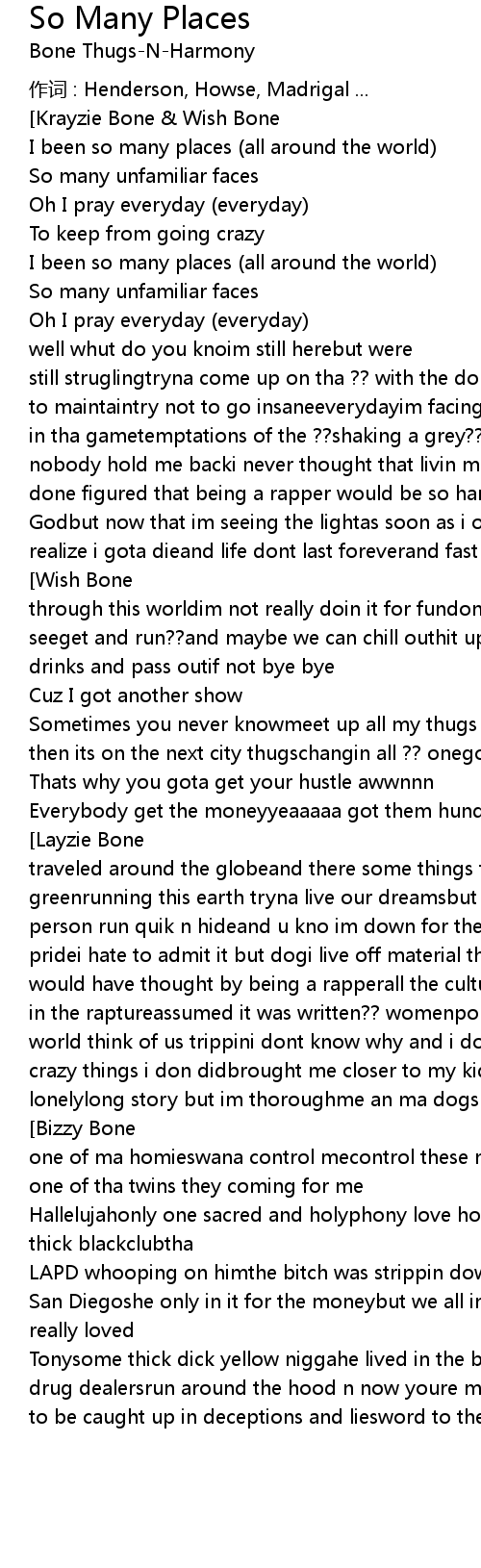 | Godbut now that im seeing the lightas soon as i open my eyesfor the first timei realize i gota dieand life dont last foreverand fast living make ya crazyif ya suck up too much trust mei seen it enough[Chorus][Wish Bone]the hustle goin through this worldim not really doin it for fundont worry bout mehave a ??and i seeget and run??and maybe we can chill outhit up a couple of your spotshave some drinks and pass outif not bye bye | |
