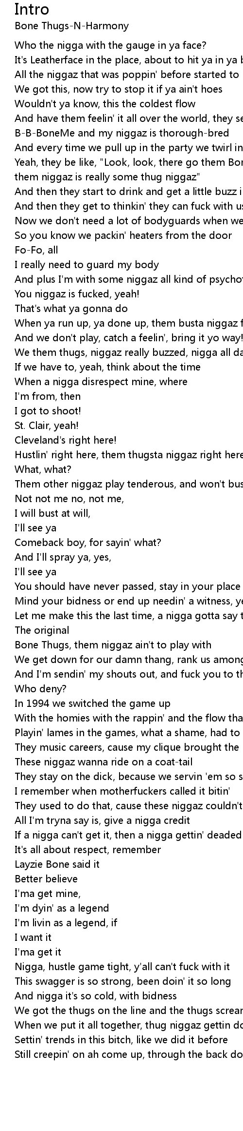 Yeah, they be like, "Look, look, there go them Bone Thug niggaz""I wonder if them niggaz is really some thug niggaz" |