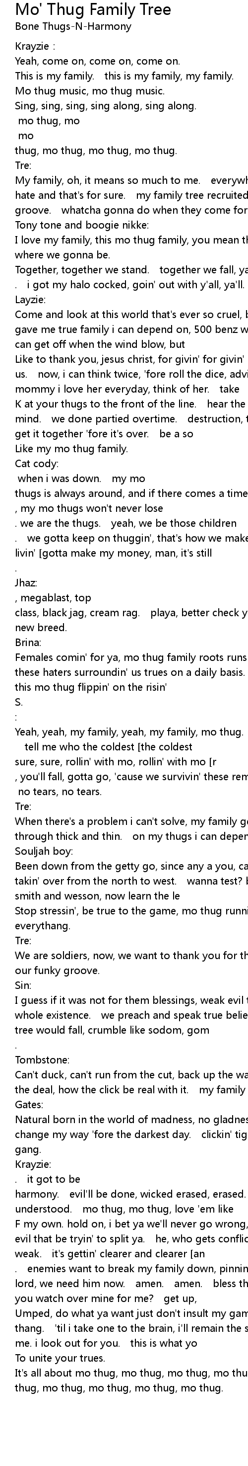 | Yeah, yeah, my family, yeah, my family, mo thug. it' s my family mo thug. tell me who the coldest the coldest the playa you know? i know for sure, sure, rollin' with mo, rollin' with mo r | |