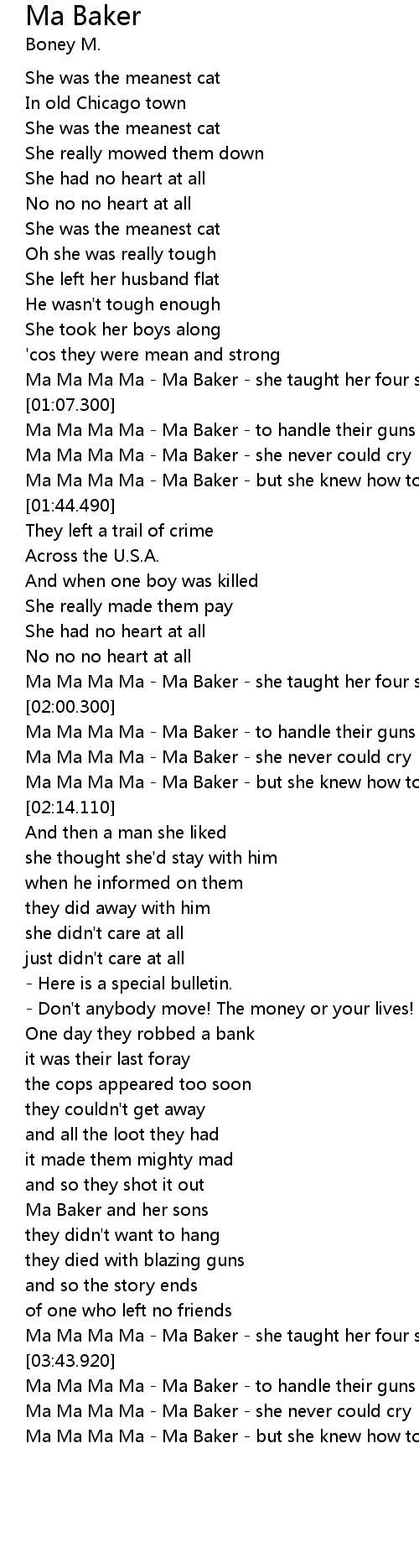 | [03:47.600] | Ma Ma Ma Ma - Ma Baker - she never could cry |