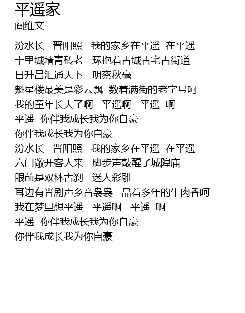 | [03:11.65] | 平遥 你伴我成长我为你自豪 你伴我成长我为你自豪 |