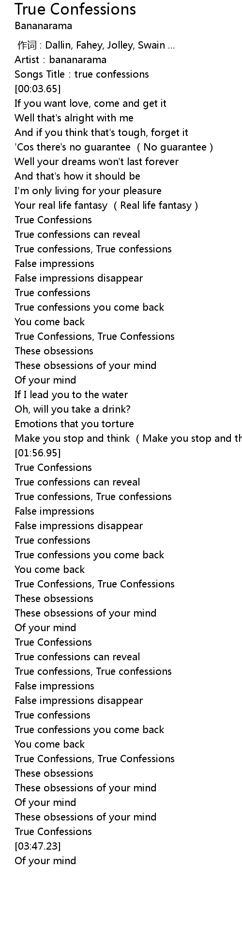 | [03:14.87] | True confessions, True confessions |