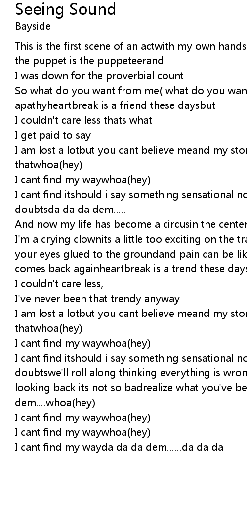I cant find itshould i say something sensational nowthis life comes with some doubtswe'll roll along thinking everything is wrongwatch our lives from afarbut looking back its not so badrealize what you've been missingda da da dem....whoa(hey) |