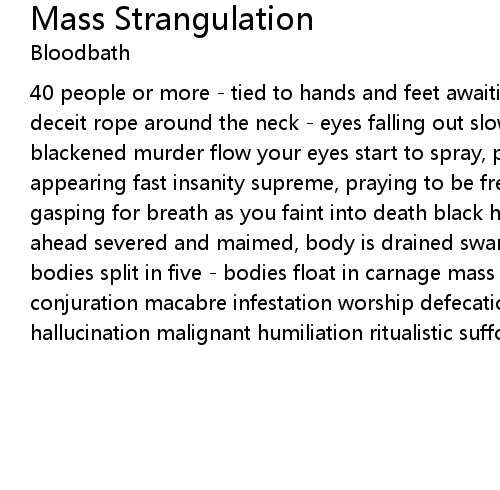 40 people or more - tied to hands and feet awaiting strangulation - darkening deceit rope around the neck - eyes falling out slow extreme asphyxiation - blackened murder flow your eyes start to spray, panic in dismay deathwish appearing fast insanity supreme, praying to be free guts explode in a blast gasping for breath as you faint into death black hallucinations and shadows ahead severed and maimed, body is drained swarming of flies round the dead bodies split in five - bodies float in carnage mass strangulation hysteric conjuration macabre infestation worship defecation soul evisceration death hallucination malignant humiliation ritualistic suffocation