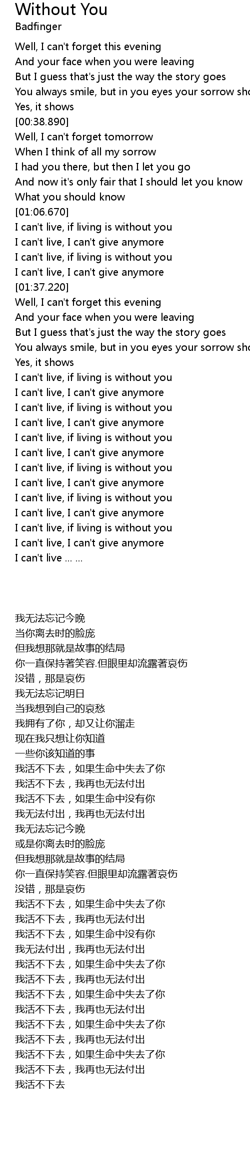 | [01:24.370] | I can't live, if living is without you |