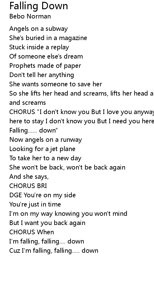 CHORUS "I don't know you But I love you anyway I can't see you But I hope you're here to stay I don't know you But I need you here with me Cuz I'm falling, Falling...... down" |