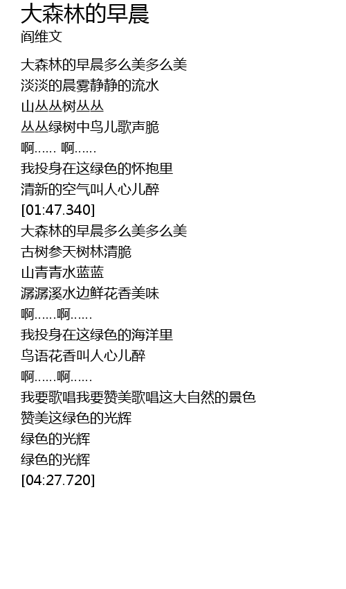 | [02:20.050] | 大森林的早晨多么美多么美 |