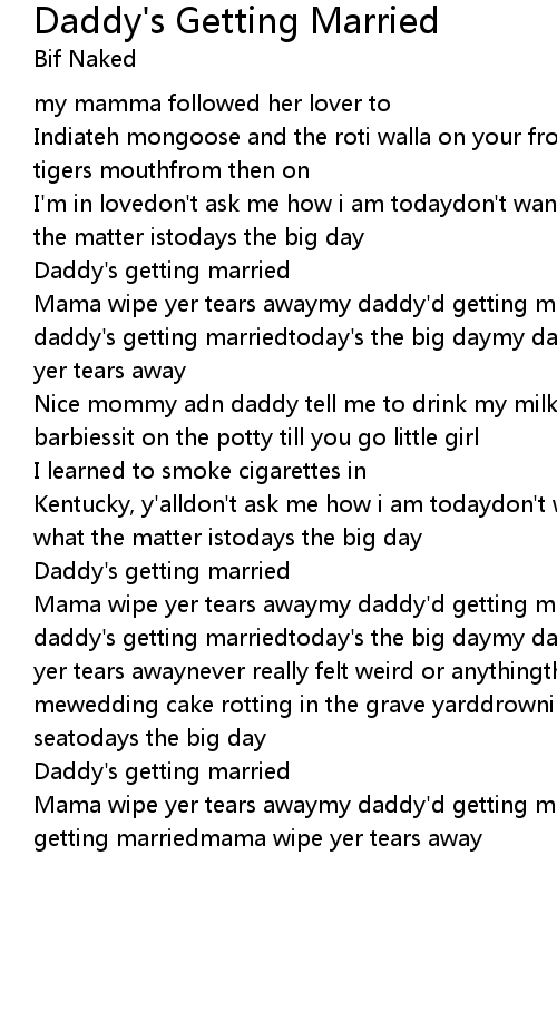 | Mama wipe yer tears awaymy daddy'd getting marriedtoday's the big daymy daddy's getting marriedmama wipe yer tears away |