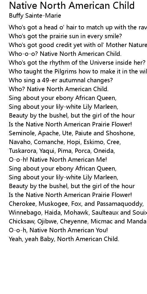 Winnebago, Haida, Mohawk, Saulteaux and Souix, |