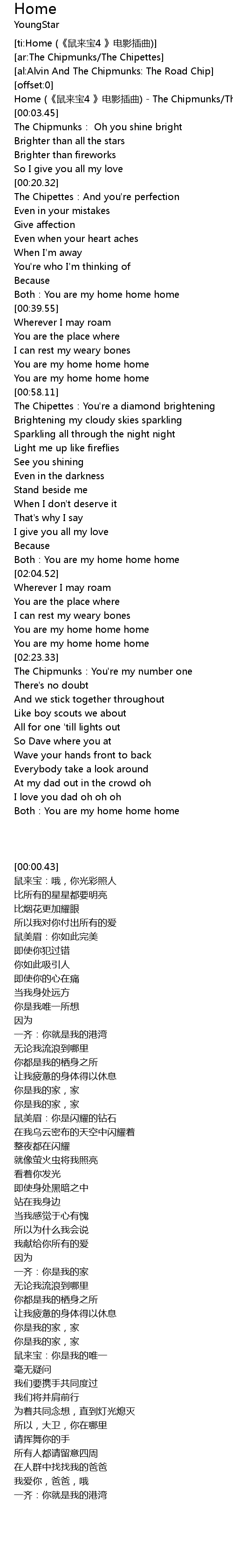| [00:00.43] | Home (《鼠来宝4 》电影插曲) - The Chipmunks/The Chipettes |
