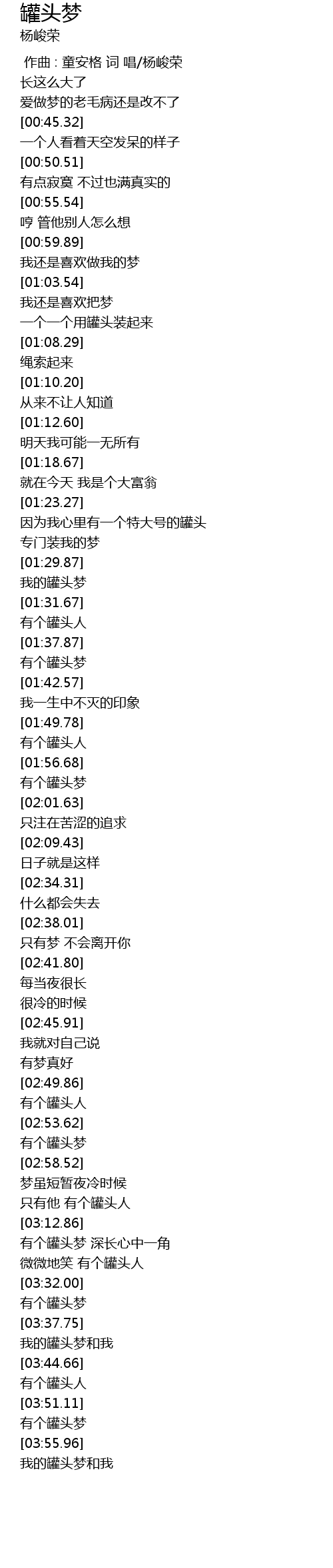 | [03:32.95] | yǒu gè guàn tou mèng |