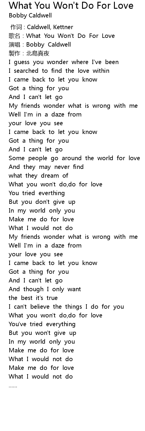 | [00:01.16] | 歌名:What You Won't Do For Love |