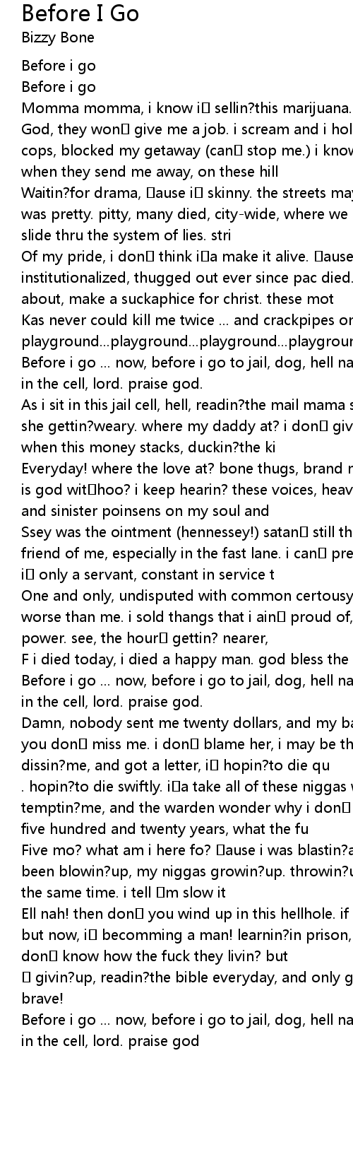 | Before i go ... now, before i go to jail, dog, hell nah! don let m put me in the cell, lord. praise god. | |