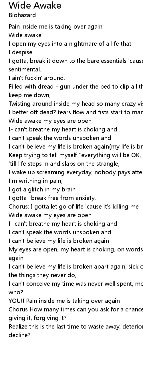 My eyes are open, my heart is choking, on words unspoken, my life is broken again |