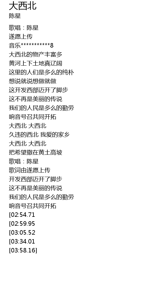 | [03:17.52][02:54.71][02:32.18] | 大西北 大西北 |