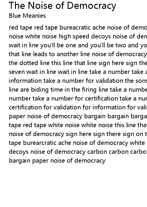 red tape red tape bureacratic ache noise of democracy red tape red tape white noise white noise high speed decoys noise of democracy white noise white noise wait in line you'll be one and you'll be two and you'll wait in line this line that line leads to another line noise of democracy sign here sign there sign on the dotted line this line that line sign here sign there three four five six seven wait in line wait in line take a number take a number take a number for information take a number for validation the sons and daughters of the filing line are biding time in the firing line take a number take a number take a number take a number for certification take a number for information for certification for validation for information for validation carbon carbon carbon paper noise of democracy bargain bargain bargain paper noise of democracy red tape red tape white noise white noise this line that line leads to another line noise of democracy sign here sign there sign on the dotted line red tape red tape burearcratic ache noise of democracy white noise white noise high speed decoys noise of democracy carbon carbon carbon paper noise of democracy bargain bargain paper noise of democracy |