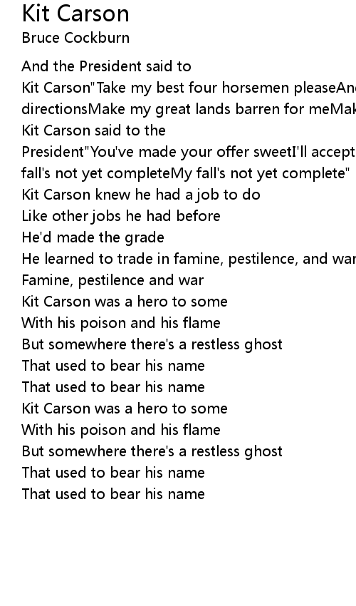 Kit Carson"Take my best four horsemen pleaseAnd ride out to the four directionsMake my great lands barren for meMake my great lands barren for me"