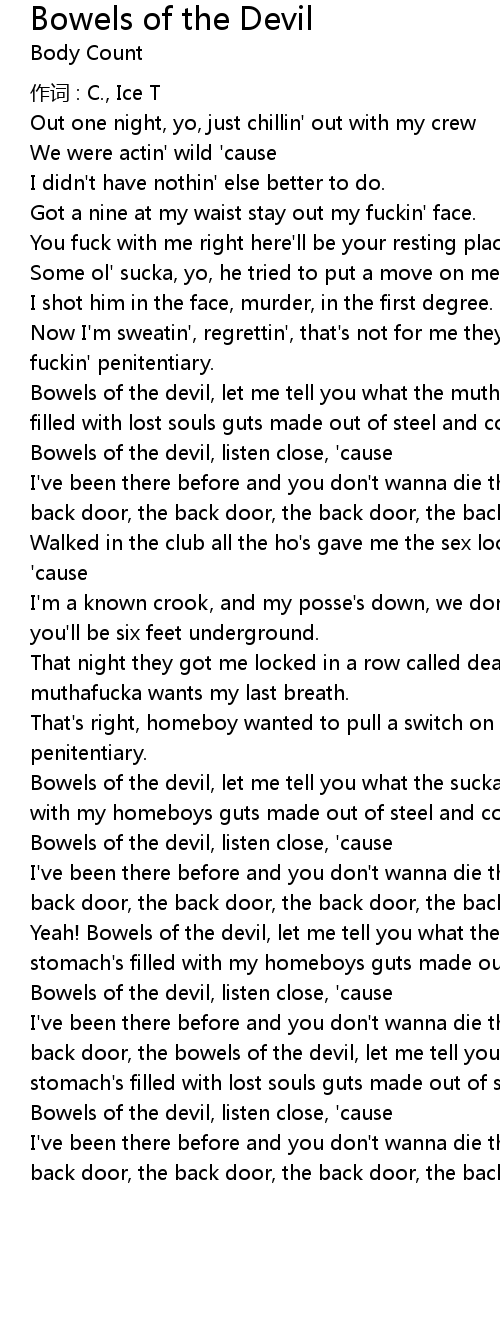 | I' ve been there before and you don' t wanna die there, they call it goin' out the back door, the bowels of the devil, let me tell you what that sucka eats, its stomach' s filled with lost souls guts made out of steel and concrete. | |