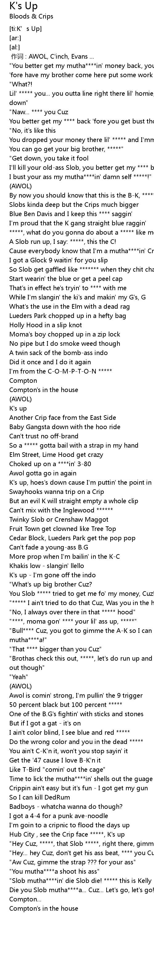 | [03:17.70] | Hub City , see the Crip face *****, K's up |