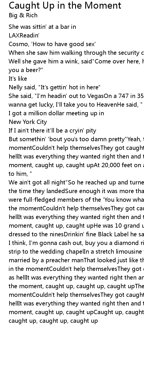 But somethin' 'bout you's too damn pretty"Yeah, they got caught up in the momentCouldn't help themselvesThey got caught up in the moment, got wild as hellIt was everything they wanted right then and thereThey got caught up in the moment, caught up, caught upAt 20,000 feet on a South West flightShe whispered to him, " |