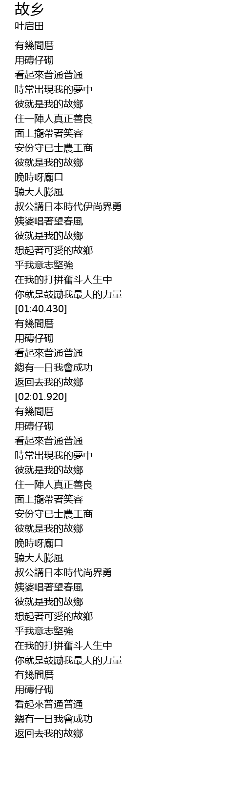 | [03:32.650] | xiǎng qǐ zhe kě ài de gù xiāng |