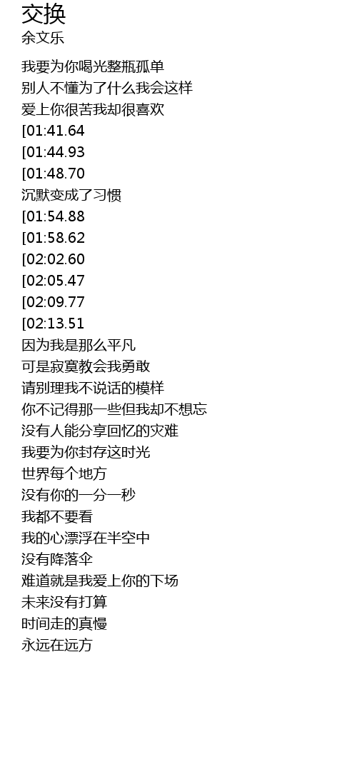 | [00:51.43][01:58.62][02:43.31] | 爱情要拿什么交换 |