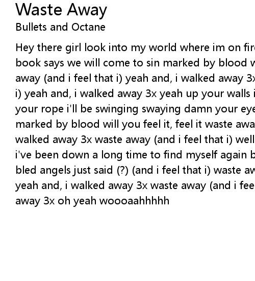 Hey there girl look into my world where im on fire and im slowly fading good book says we will come to sin marked by blood will you feel it, feel it waste away (and i feel that i) yeah and, i walked away 3x waste away (and i feel that i) yeah and, i walked away 3x yeah up your walls i will surely crawl and down your rope i'll be swinging swaying damn your eyes rolling by the signs (?) marked by blood will you feel it, feel it waste away (and i feel that i) well i walked away 3x waste away (and i feel that i) well i walked away 3x yeah well i've been down a long time to find myself again back at the beginning beat and bled angels just said (?) (and i feel that i) waste away (and i feel that i) yeah and, i walked away 3x waste away (and i feel that i) yeah and, i walked away 3x oh yeah woooaahhhhh |