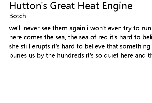 | we'll never see them again i won't even try to run because it's kinda pointless here comes the sea, the sea of red it's hard to believe that our end has come oh she still erupts it's hard to believe that something so thick is so quick but it buries us by the hundreds it's so quiet here and the heat is my new friend |