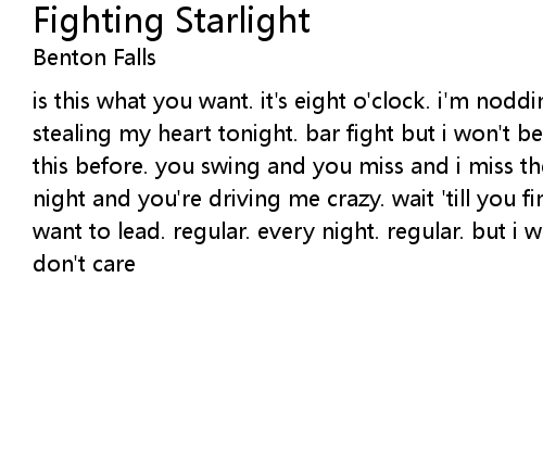 | is this what you want. it's eight o'clock. i'm nodding off. starlight is stealing my heart tonight. bar fight but i won't be there. and i've tried all this before. you swing and you miss and i miss the way things used to be. late night and you're driving me crazy. wait 'till you find this ain't the life you want to lead. regular. every night. regular. but i won't fight you. what if i don't care |
