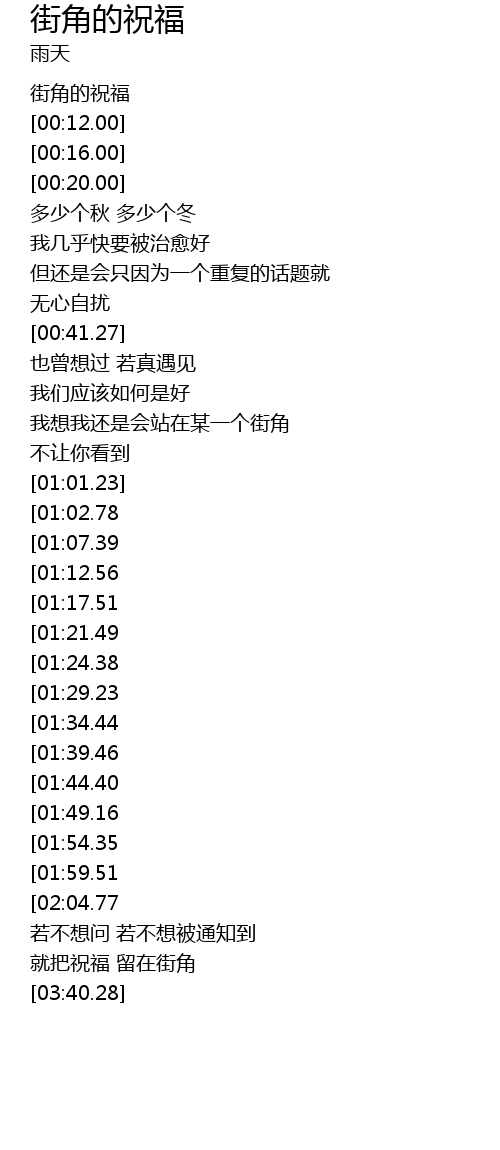 | [03:29.43] | jiù bǎ zhù fú liú zài jiē jiǎo |