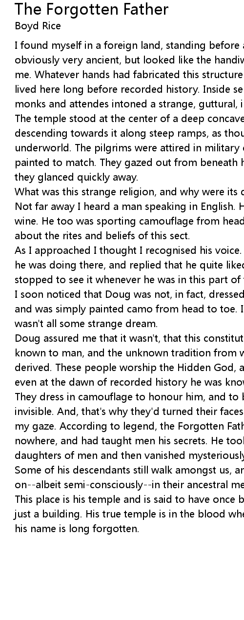 | They dress in camouflage to honour him, and to be like unto him. Hidden, unseen, invisible. And, that's why they'd turned their faces from me and refused to meet my gaze. According to legend, the Forgotten Father had come seemingly from nowhere, and had taught men his secrets. He took many wives from amongst the daughters of men and then vanished mysteriously back to where he had come from. | |