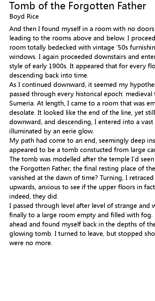 | I passed through level after level of strange and wondrous things, coming finally to a large room empty and filled with fog. Pausing but briefly, I forged ahead and found myself back in the depths of the earth, standing before the same glowing tomb. I turned to leave, but stopped short. The stairs I'd just climbed were no more. |