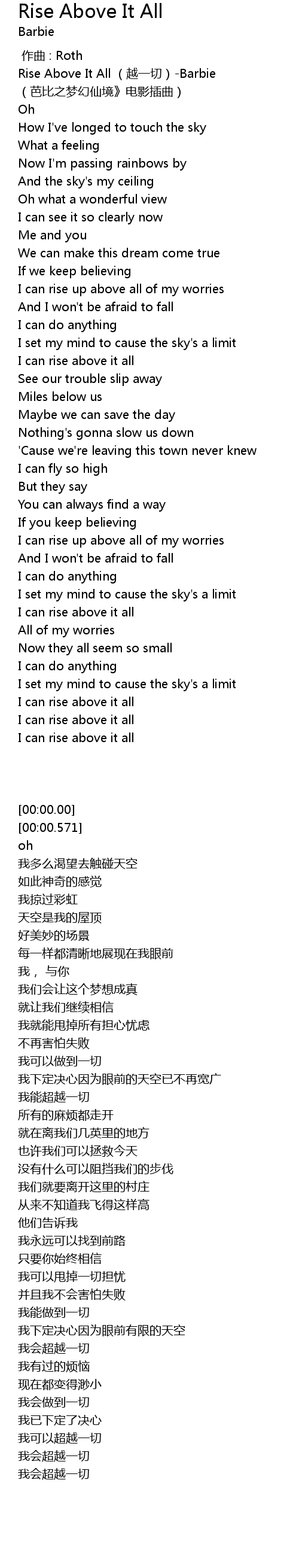| [00:00.00] | Rise Above It All (越一切)-Barbie |