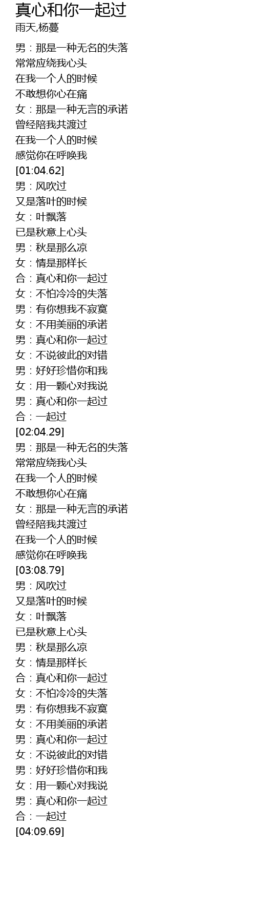 | [01:55.61] | nán: zhēn xīn hé nǐ yì qǐ guò |