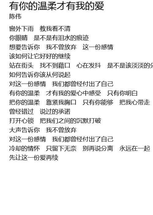 | 把你的温柔 靠紧我胸口 只有你能够 把我心带走 | |
