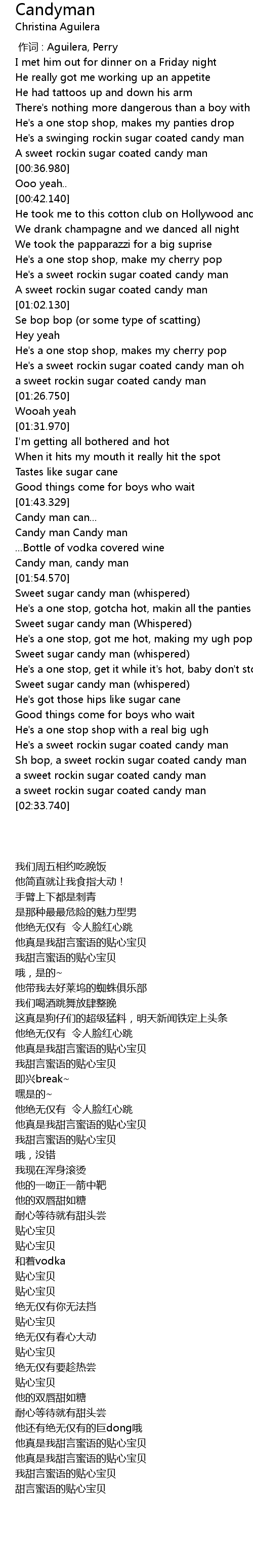| [02:00.530] | Sweet sugar candy man (Whispered) |