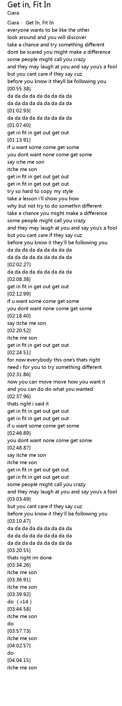 | [00:03.06] | Ciara - Get In, Fit In |