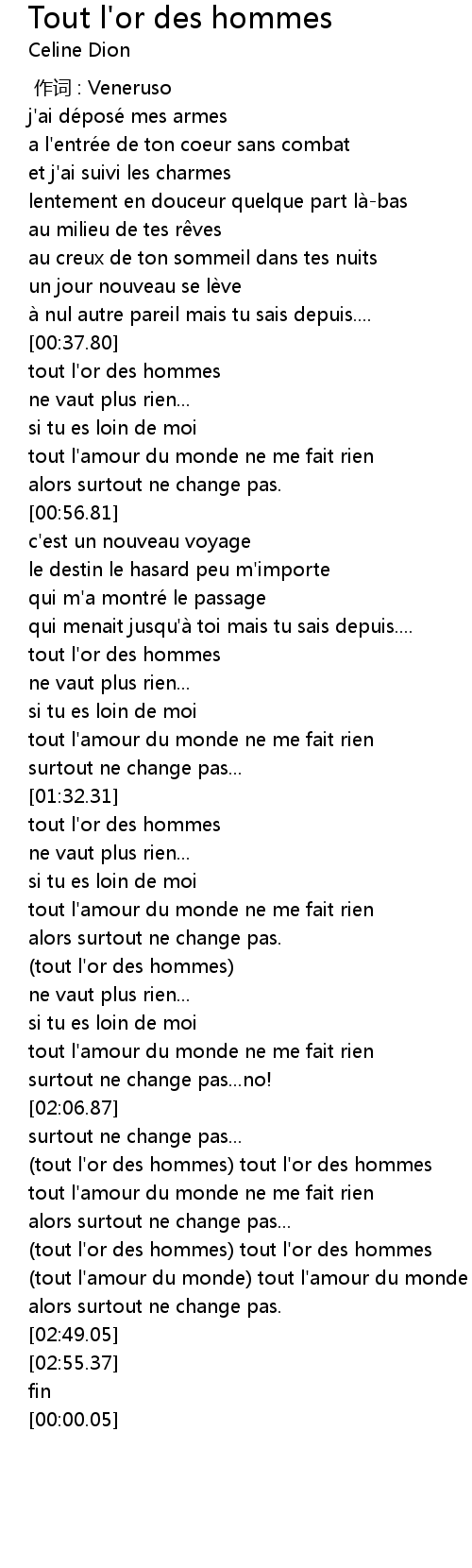 | [02:30.74] | tout l' or des hommes tout l' or des hommes |