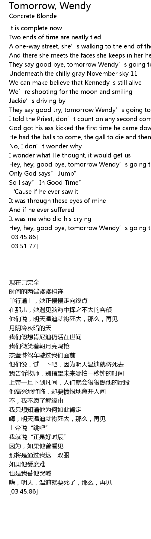 | [00:37.84] | They say good bye, tomorrow Wendy’s going to die |