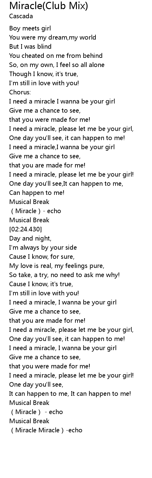 | [01:43.940] | I need a miracle, I wanna be your girl |