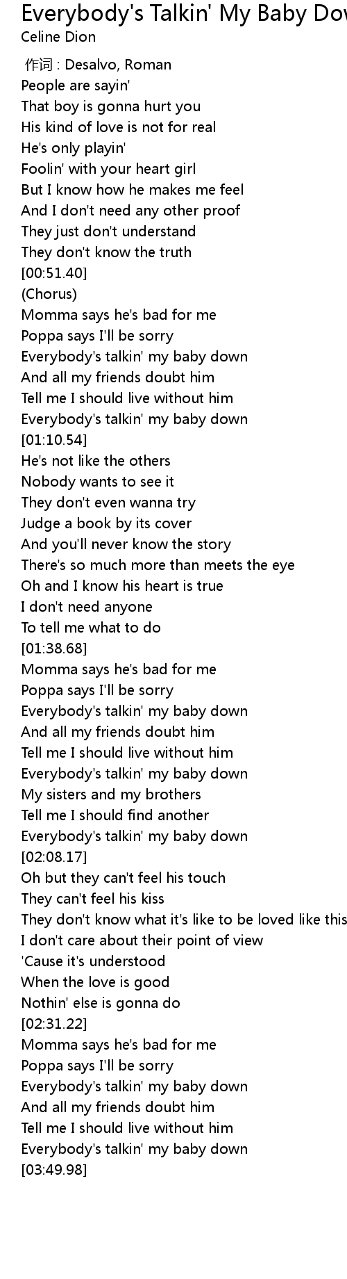 | [02:02.95] | Everybody' s talkin' my baby down |